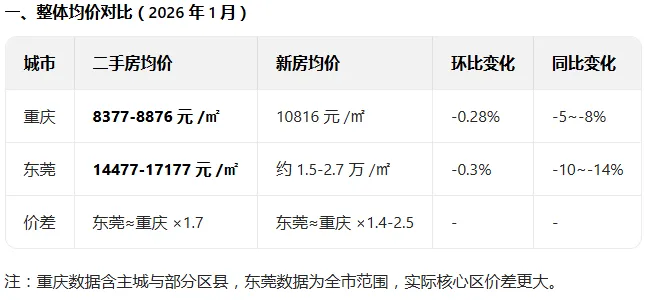 资料显示东莞房价约为重庆的 1.7 倍(二手房均价对比),核心区价差更显著;两地均处调整周期,但东莞二手房活跃度更高,重庆则以高性价比和更大选择空间见长。在重庆打车时,跟滴滴师傅闲聊了两句。师傅笑着说,我们这里就是三线的房价,在重庆打拼的普通人,大多都能攒钱买上房,生活压力不算大,唯一的缺点便是夏天很热。我来得巧,正赶上冬天,完美避开了这份燥热,眼里只剩这座城市的包容与宜居。