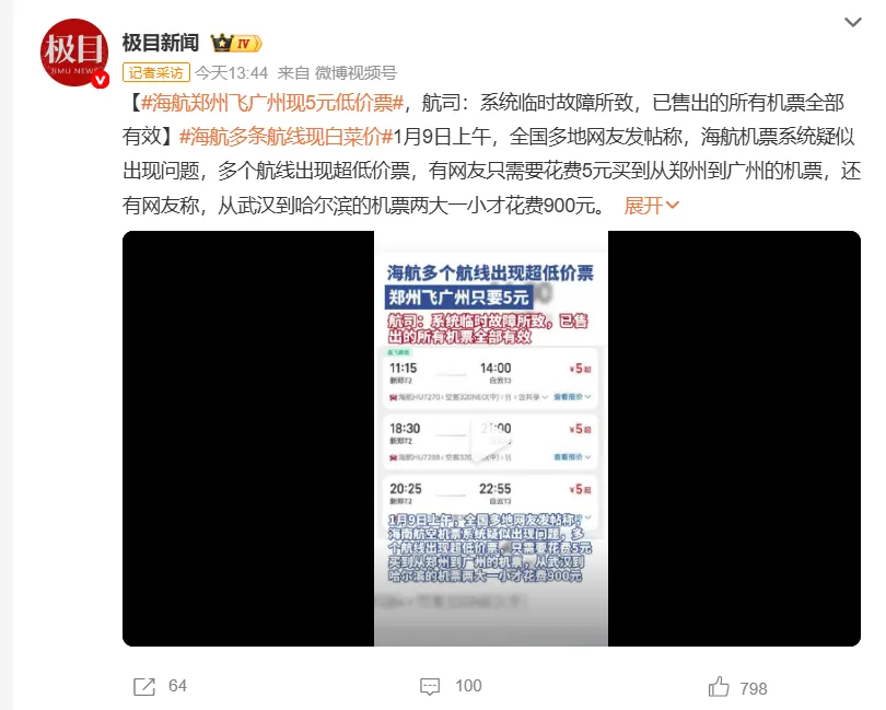 据极目新闻报道,1月9日上午,全国多地网友都发现了蹊跷事:海南航空多个航线的机票价格低到离谱。
