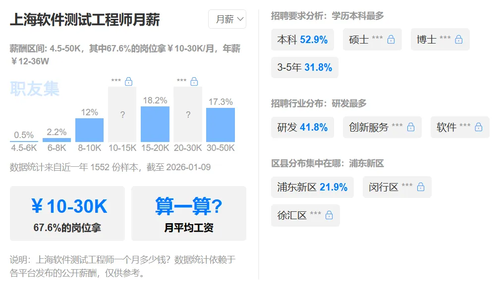 据职友集最新数据,以上海为例,软件测试工程师的薪酬区间在4.5K-50K之间,其中67.6%的岗位月薪能拿到10-30K,换算成年薪就是12-36万。