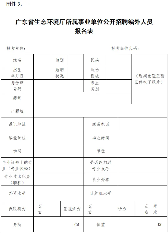 (1)《广东省生态环境厅所属事业单位公开招聘编外人员报名表》(附件3)