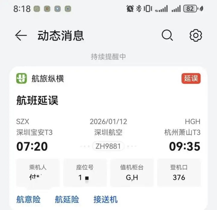 刚刚,@深圳航空通报称:1月12日,深圳航空ZH9881航班(深圳-杭州)飞机在地面滑出时发生故障。机组按程序滑回排故,期间深航现场做好服务保障。目前航班已于11:20从深圳宝安国际机场顺利起飞,预计12:50抵达杭州萧山国际机场。深航始终将旅客的安全放在首位,对于此次航班延误给旅客出行带来的不便,深圳航空深表歉意,感谢大家的理解与支持。