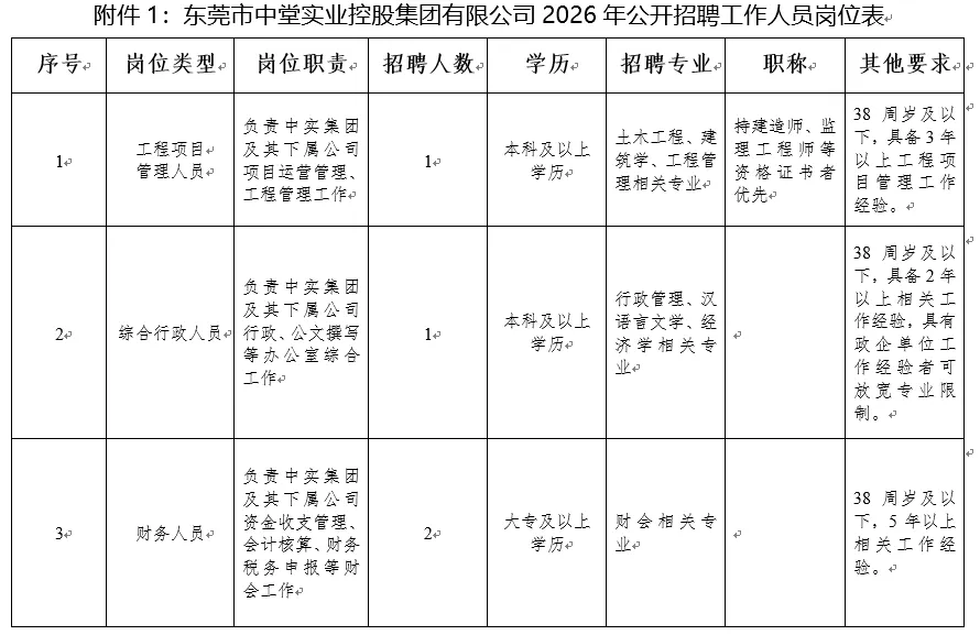 详见附件1《东莞市中堂实业控股集团有限公司2026年公开招聘工作人员岗位表》。