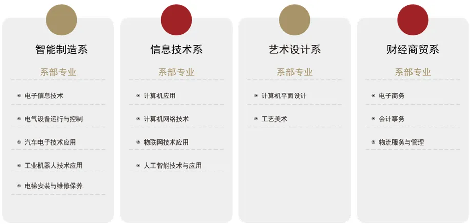 结合当地企业及IT产业发展的需求,学校坚持品牌专业建设,开设有电子信息技术、电气设备运行与控制、汽车电子技术应用、工业机器人技术应用、电梯安装与维修保养、人工智能技术与应用、计算机应用、计算机平面设计、计算机网络技术、物联网技术应用、工艺美术、电子商务、会计事务、物流服务与管理等14个专业。其中电气设备运行与控制为省重点建设专业,电子信息技术和计算机平面设计是广东省“双精准”示范专业。