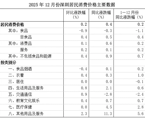 2025年12月份,深圳居民消费价格同比上涨0.4%,涨幅与上月持平,环比由上月下降0.3%转为上涨0.2%。1—12月平均,深圳居民消费价格比上年同期上涨0.2%。