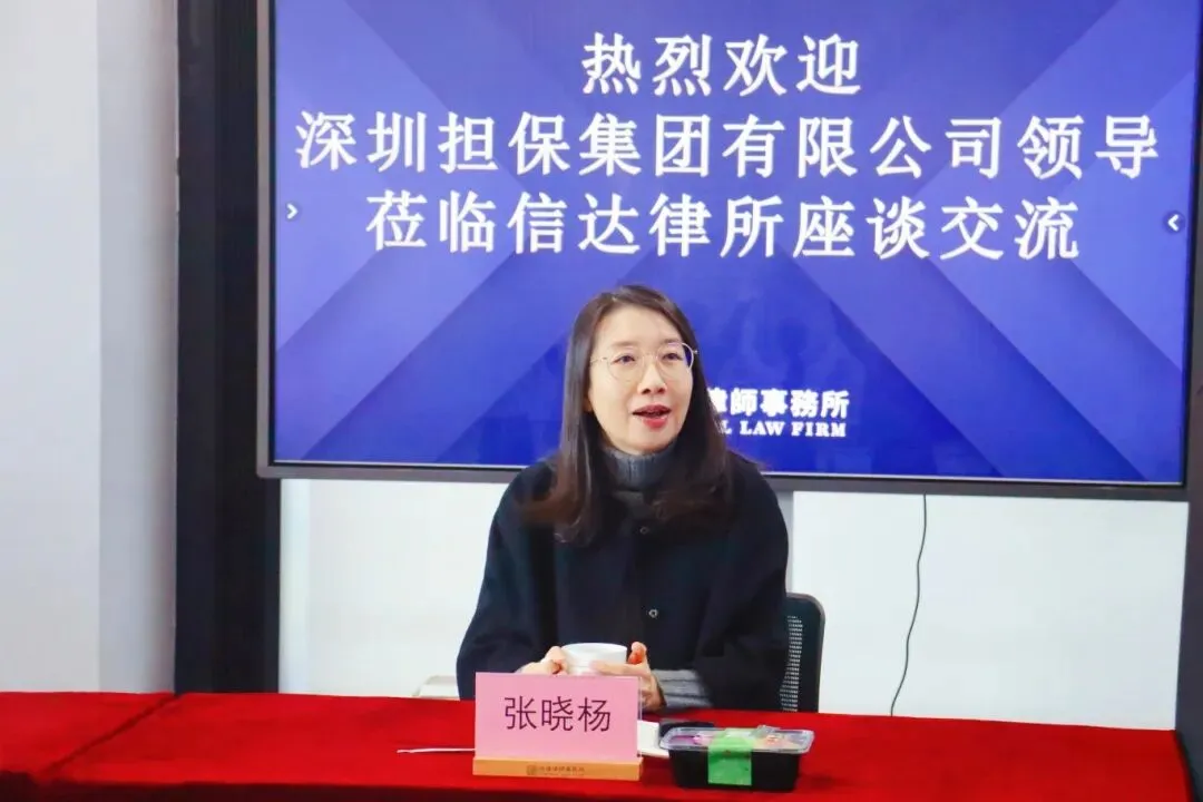 2026年1月9日,深圳市中小企业融资担保有限公司(简称“深圳中小担”)总经理张晓杨、副总经理杨蓉婧、风控部法务经理廖侑宏、福田分公司项目经理余嘉俊一行到访信达律师事务所深圳总部,并与信达开展新年座谈交流活动。此次会议由合伙人杨斌律师主持,信达首席合伙人麻云燕律师,信达管委会成员/高级合伙人魏天慧律师、陈勇律师、林勇律师,信达党总支副书记宋歌律师,合伙人欧阳劲松律师、马冬梅律师共同参与了本次座谈交流会。