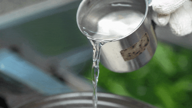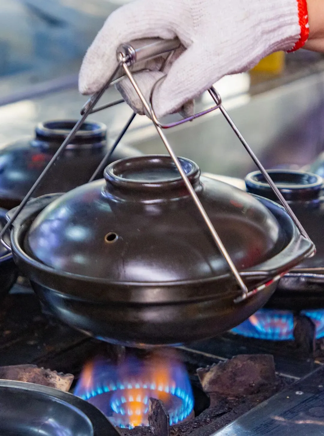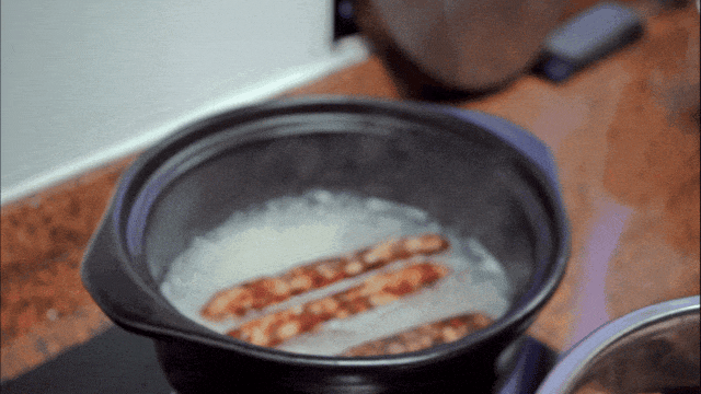 准备好“煲仔”,刷油、放米、倒水,大火烹煮。当水分收干时,及时码上斩好成块的油鸭,铺上姜丝。