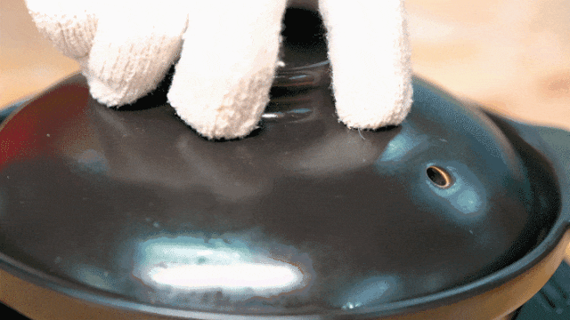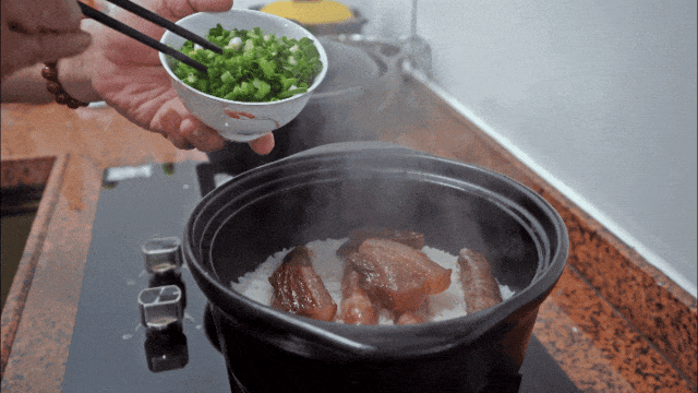 盖上煲盖,转小火焖煮,不用几分钟,饭香、腊香,还未掀盖就先窜入了鼻尖……这时,放入焯过水的菜心,再沥上点提鲜的酱油、撒上葱花,一煲色香味俱全的腊鸭饭就可以上桌了。