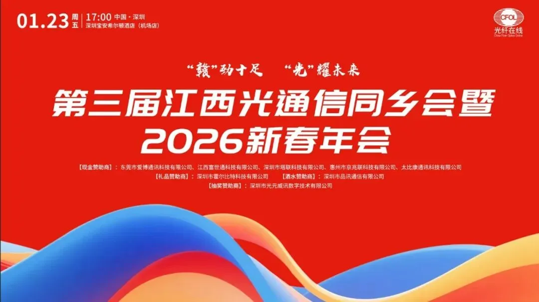 1/09/2026,光纤在线讯,时光荏苒,情谊不变。自2020年首届江西光通信老乡会在深圳成功举办,到2023年第二届于苏州圆满落幕,这场以乡情为纽带、以行业为桥梁的聚会,始终承载着众多江西籍光通信人的热情与期待。时隔多年,今年,“第三届江西光通信同乡会暨2026新春年会”将于本月在深圳再度启幕!自活动公告发布以来,得到光通信江西同乡的积极报名,目前人员接近百人,活动报名已截止。让我们共同期待江西籍光通信老表们共聚一堂,以乡音叙乡情,以交流促合作,共话行业趋势,共绘发展蓝图。