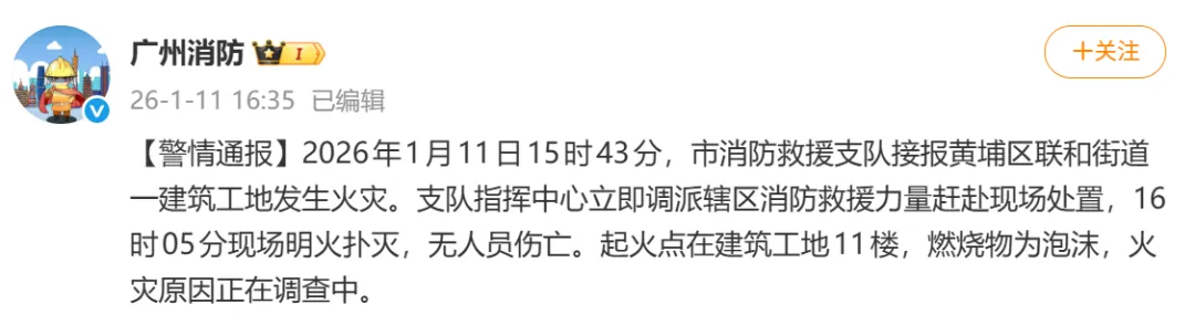 1月11日下午,@广州消防 发布警情通报:2026年1月11日15时43分,市消防救援支队接报黄埔区联和街道一建筑工地发生火灾。支队指挥中心立即调派辖区消防救援力量赶赴现场处置,16时05分现场明火扑灭,无人员伤亡。起火点在建筑工地11楼,燃烧物为泡沫,火灾原因正在调查中。