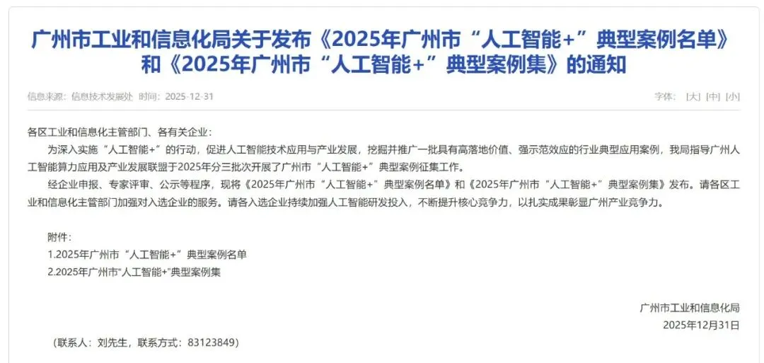 经企业申报、专家评审、公示等程序,现将《2025年广州市“人工智能+”典型案例名单》和《2025年广州市“人工智能+”典型案例集》发布。请各区工业和信息化主管部门加强对入选企业的服务。请各入选企业持续加强人工智能研发投入,不断提升核心竞争力,以扎实成果彰显广州产业竞争力。