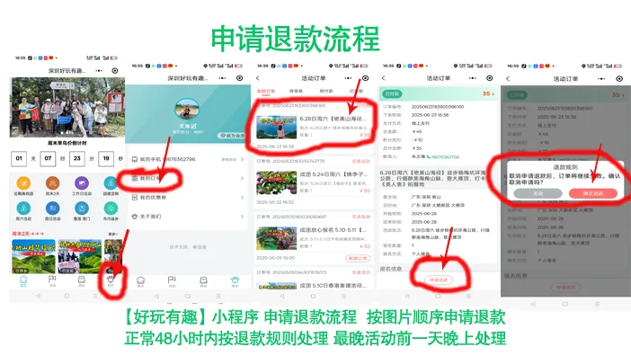 深圳好玩有趣户外小程序首页--右下角我的--活动订单--点开本次活动订单--拉到最底下有红色字体申请退款(48小时内原路退款到账)。