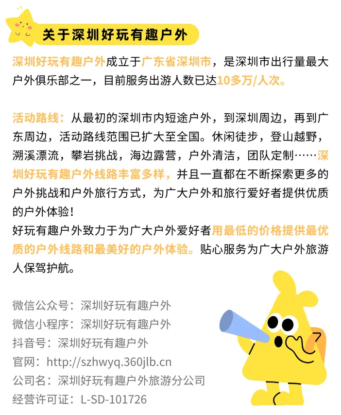 必带:运动鞋、双肩背包(徒步禁止手提袋)午餐干粮,水至少1.5L+备用功能饮料,雨伞/雨衣(有备无患)