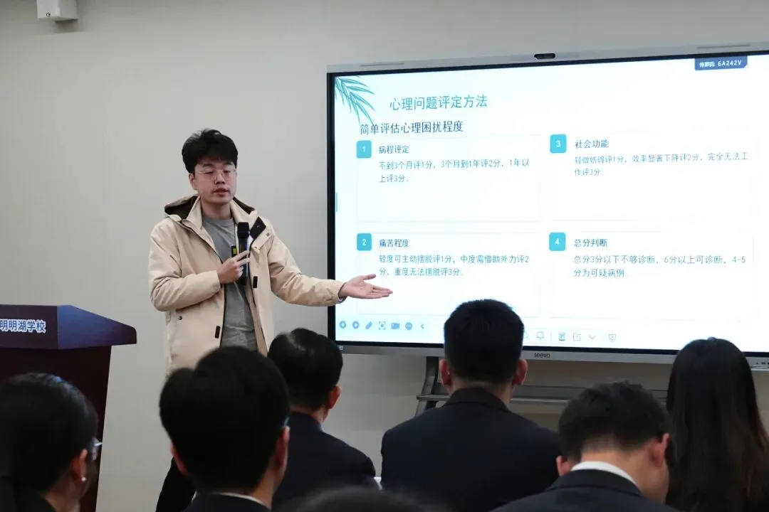 此次心理健康专题培训,内容详实、针对性强,有效提升了我校教职工对学生心理健康常见问题的识别和应对能力。深圳实验光明明湖学校将持续把心理健康教育摆在突出位置,深化校家社协同育人,完善心理危机预防与干预体系,为培养“人格健全、学业进步、特长明显、和谐发展”的实验学子奠定坚实的心理基础。