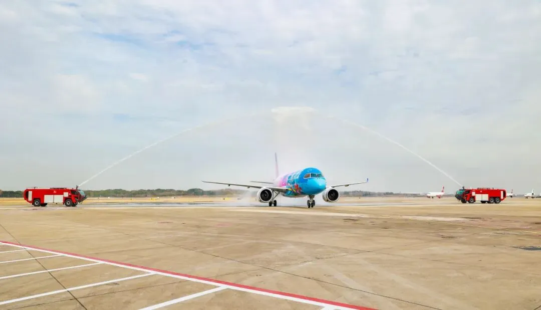 1月12日,中国南方航空C919型国产大飞机“大美湾区号”彩绘机穿过“水门”,顺利完成广州至南京首航,平稳降落在南京禄口国际机场。飞机采用164座三舱布局,包含8个公务舱座位、18个明珠经济舱座位和138个经济舱座位,装配了定制化的客舱座椅等设施设备,全舱配置个人充电接口,为乘客提供便捷舒适的乘机体验。