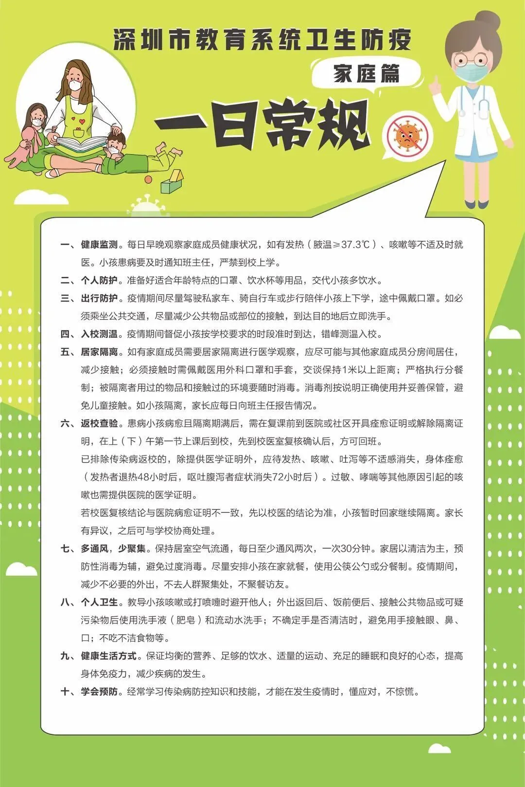 返校在即,小伙伴们都期待与老师、同学们见面。返校后,做好卫生防疫工作是重中之重,学校、老师、家长、同学们应该怎样做?别担心,深圳市教育局为大家带来了《深圳市教育系统卫生防疫一日常规》,这些实用易懂的防控知识赶紧Get起来!下面,为大家介绍《深圳市教育系统卫生防疫一日常规(家庭篇)》↓↓