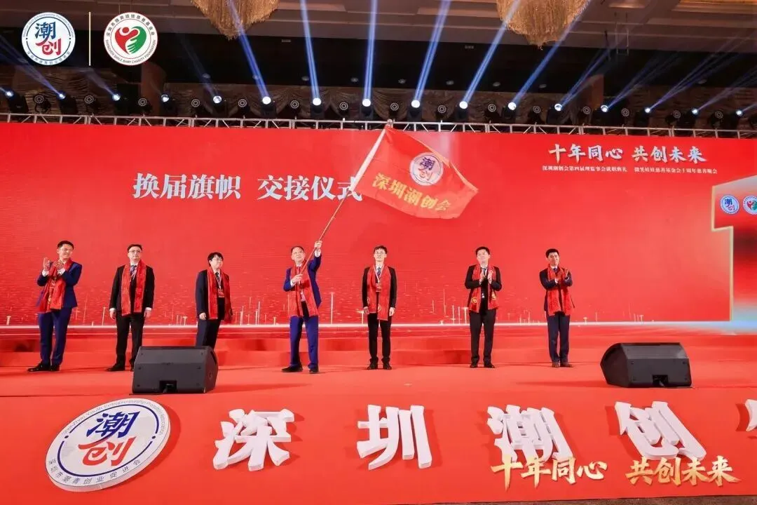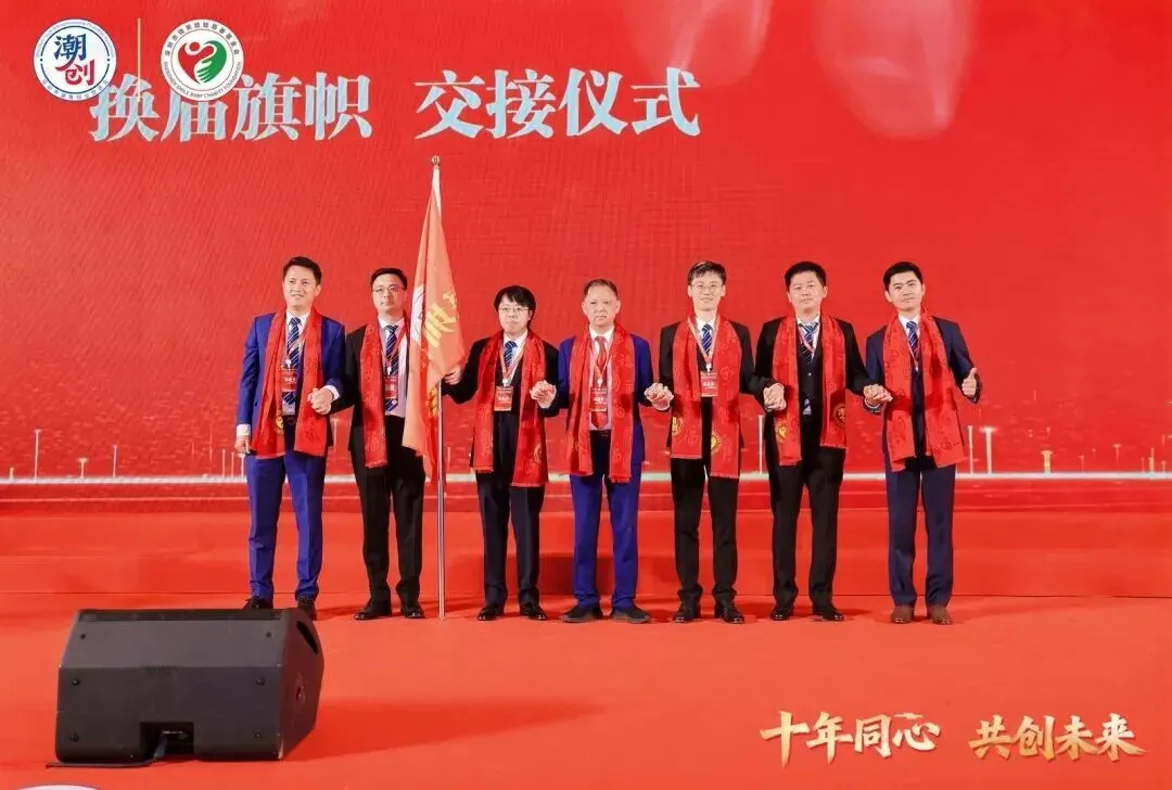 在万众瞩目的换届旗子交接仪式上,陈俊林主席依次将旗帜传递给黄敏聪主席、陈锋主席、蔡文川会长,最终由黄大伟主席、蔡浩东监事会主席、陈森鸿党支部书记共同接过,完成了组织传承的重要仪式,标志着深圳潮创会迈入发展新阶段。