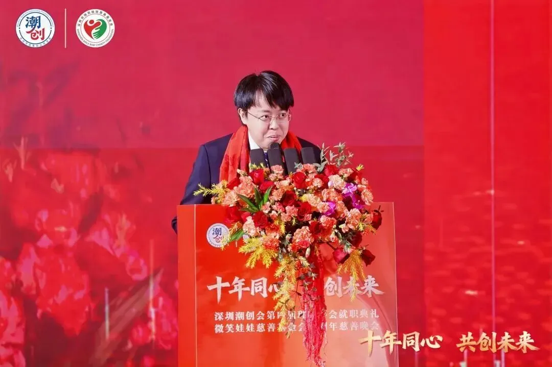 深圳市儿童医院院长麻晓鹏讲话,他表示对深圳潮创会第四届理监事会就职、微笑娃娃基金会成立十周年表示热烈祝贺,并向长期支持医院发展的微笑娃娃慈善基金会致以诚挚感谢。他介绍,双方自 2022 年结缘以来,微笑娃娃慈善基金会已累计资助380余名兔唇患儿,为他们送去健康的希望和温暖的微笑,这份沉甸甸的爱心我们铭记在心。2024年医院龙华院区运营后,蔡文川、邱杰钦等微笑娃娃慈善基金会共同会长慷慨捐赠,持续助力兔唇患儿的救治工作;2025年,深圳潮创学院第十四期学员参观交流活动在深圳儿童医院举办,进一步深化了双方友谊。他高度赞扬微笑娃娃慈善基金会十年如一日的善行义举,祝愿其未来宏图大展,并向在场嘉宾送上美好祝福。
