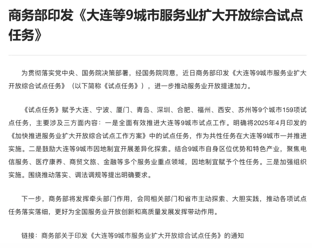 近日,商务部印发《大连等9城市服务业扩大开放综合试点任务》(以下简称《试点任务》),深圳作为试点城市之一,获得“优化升级自由贸易账户功能”“推进电子提单在航运贸易领域试用”等多项重点政策支持。这意味着深圳服务业扩大开放迎来重大利好,高水平对外开放能级将进一步提升。