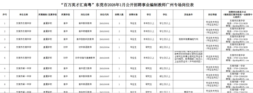 为深入贯彻落实广东省高质量发展大会精神和“百万英才汇南粤”行动计划,根据《广东省事业单位公开招聘人员办法》,围绕“粤聚英才、粤见未来”主题,东莞市教育局于2026年1月赴广州设点面向全国优秀毕业生公开招聘事业编制教师392名,公告如下: