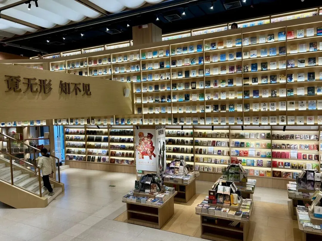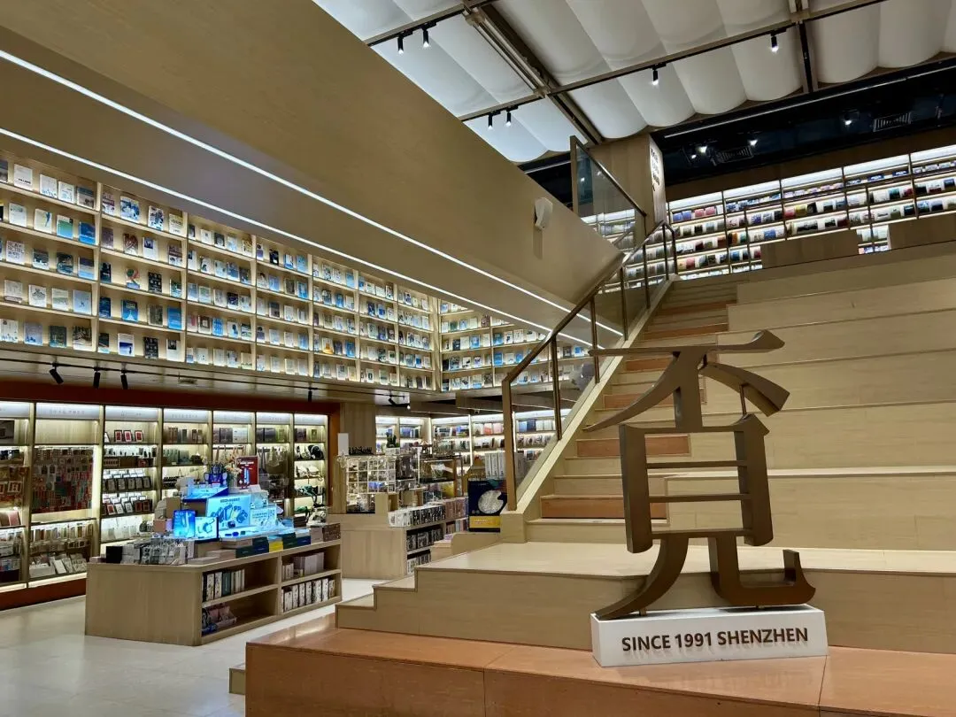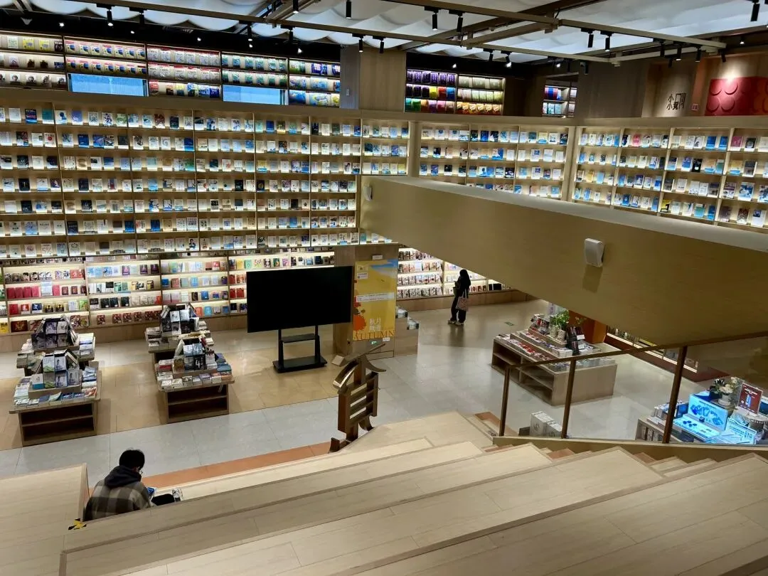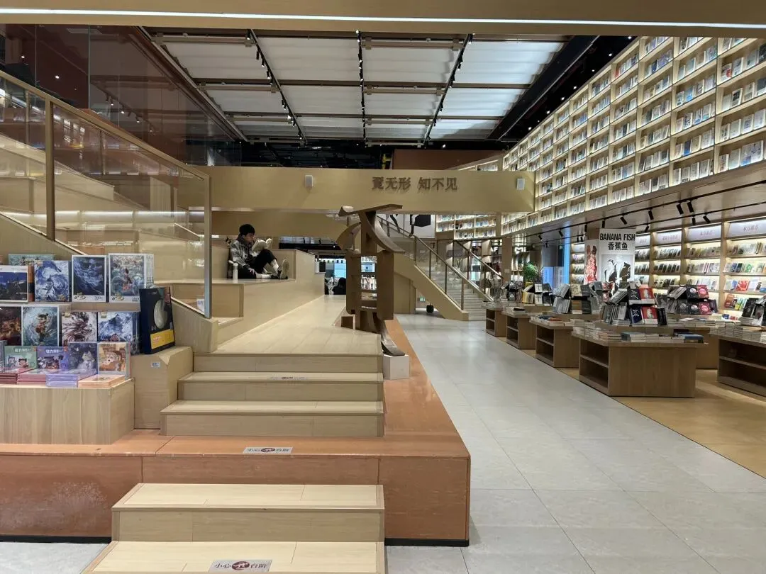 照片上这片绿茵满盈的卡通玩偶区好像是给孩子们预备的游乐园,这座免费场所就位于大悦汇广场的顶层天台,它与四楼的“覔书店”连为一体,很多来这里买书的人都不知道有这个好地方。除了充满童趣的玩偶区,这座天台的另一半是花草妆点的休闲长廊。上有透明玻璃顶棚,光线充盈;脚下是木板走廊,舒适典雅,还有几条长椅可供读者休息。说实话,这个既遮风避雨又安静的户外读书区在广州所有的书店中极为罕见。进入“覔书店”室内不觉地眼前一亮,这里整体是钟书阁风格,书店上下两层的所有墙壁都镶满了书籍,成为独特的立体空间造型,曾被报道为广州市最美书店。由于覔书店地处近郊科学城一带,在工作日来店购书的人极为稀少,因此书店也成为一些幸运读者的免费阅读空间。室内设计别致的阶梯既有艺术感又非常实用。中间大气磅礴的阶梯间隔高度足有四十公分,刚好与普通成年人座椅高度相当,果然此处的光线极佳,形成阶梯式阅读区。真正上下楼的步梯则是偏于一隅,弯转绕行到主阅读台后方。二楼的空间高度与普通书店差不多,虽然没有一楼高大,反而给人以踏实稳重的感觉。这间覔书店虽然地处广州科学城的商业繁华区,却是闹中取静的典范。交通贴士: