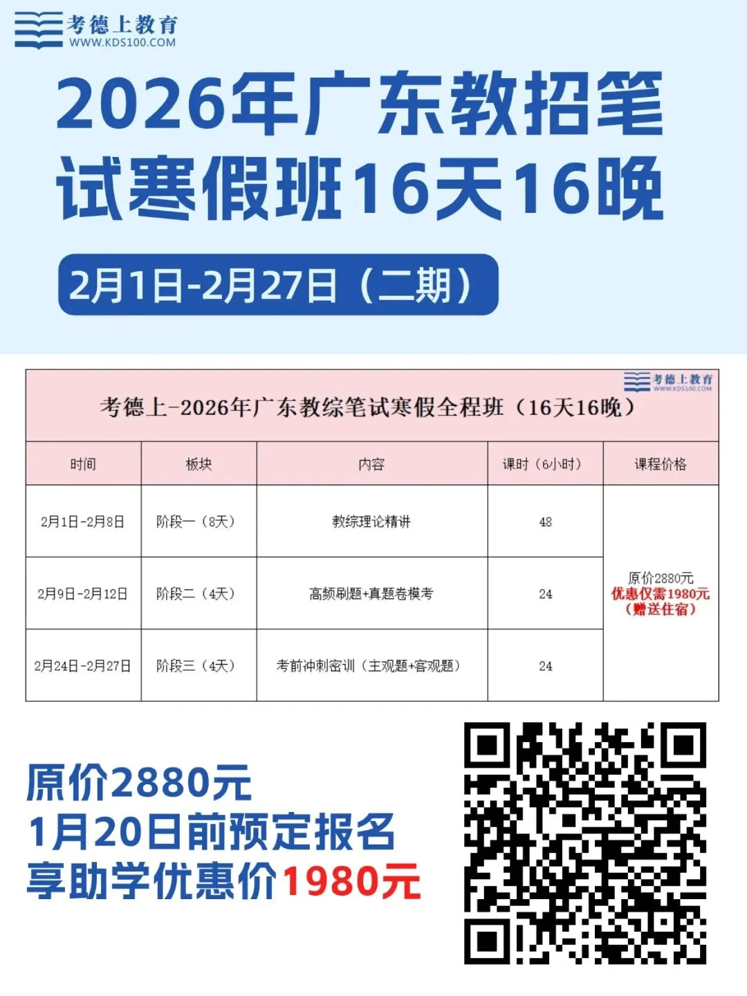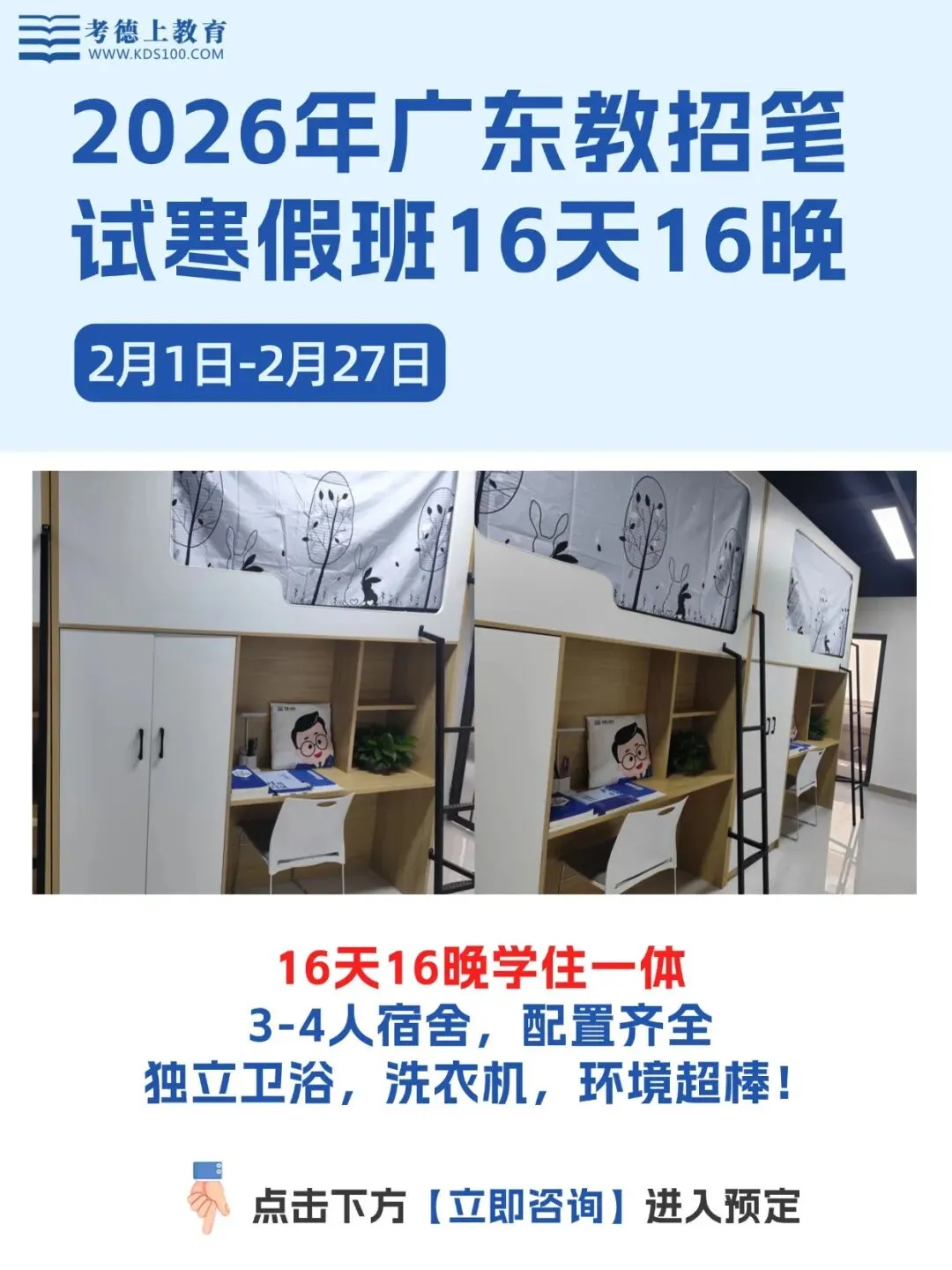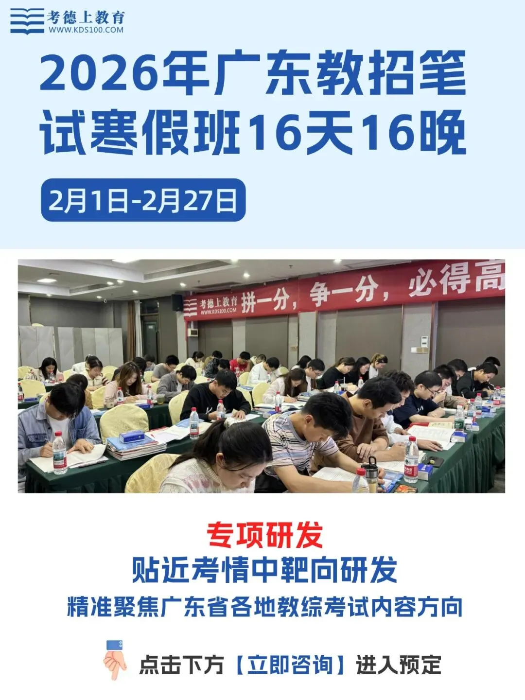 2026年广东教招笔试寒假班确定开课!!👉16天16晚全程学习,专业讲师系统梳理考点👉封闭式培训+赠送住宿,沉浸式备考氛围👉阶段上课:理论+高频刷题模考+冲刺梯式课程设置,层层进阶系统构建完备的教综知识,拿下高分!