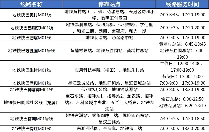 “地铁快巴”首批10条示范线重点覆盖鹤洞东、沥滘、黄村、万胜围、朱村、同和、钟落潭、龙溪、官洲、傍江等地铁站,接驳周边产业园区、学校及大型社区。具体线路信息如下: