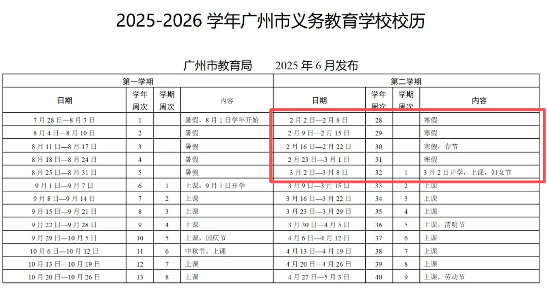 广州小学、初中2026年1月31日开始放寒假,2026年3月2日春季学期开学。合计30天。