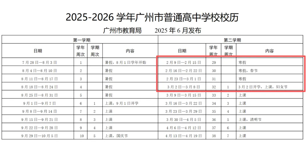 广州高中2026年2月7日开始放寒假,2026年3月2日春季学期开学。合计23天。