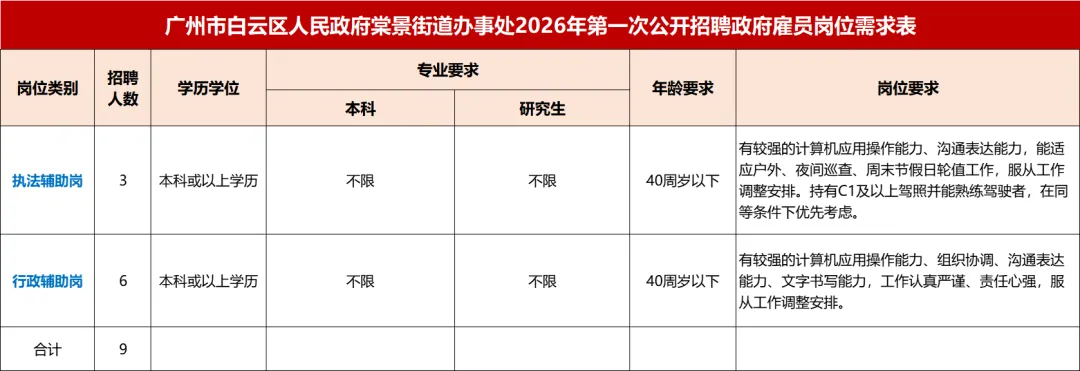 本次面向社会公开招聘9名政府雇员,其中执法辅助岗3名、行政辅助岗6名。