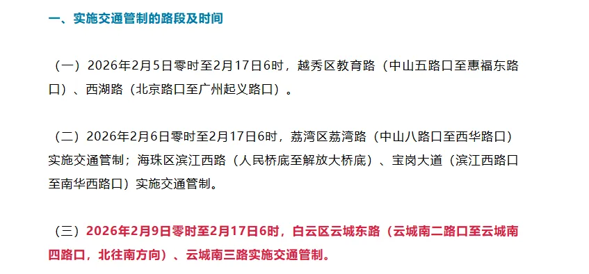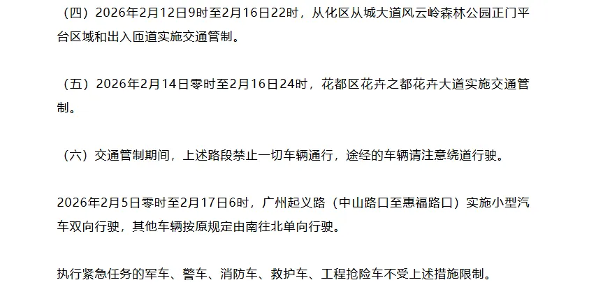 家人们注意啦!为保障2026年广州传统迎春花市顺利举办,广州市公安局交通管理支队依据相关法规,草拟了临时交通管制通告征求意见稿。管制涉及越秀、荔湾等多区路段,不同路段管制时间不同,期间大多路段禁行,部分车辆有特殊规定。公开征求意见时间为2026年1月9日至1月20日,可通过信函或电子邮箱反馈。
