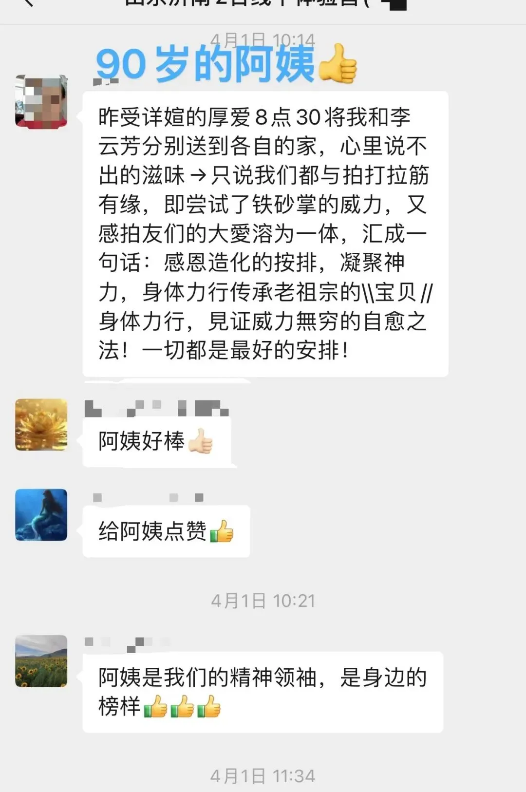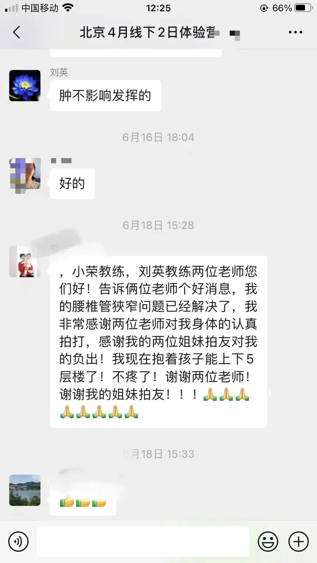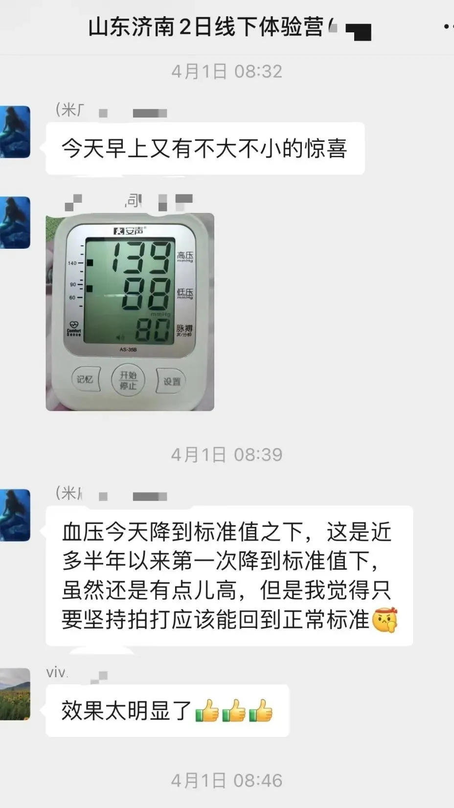 5、在体验营积极向上的氛围中,良好的气场是家里无法想象的。人越多,则拍打拉筋的谐振、共振效应越好,这让偷懒者和意志薄弱者不得不随大流,为了“面子”而自律,可谓“见贤思齐”,拍打拉筋时间便没理由省略;拍打拉筋强度也水涨船高。有些在家作威作福习惯了的老人和家长,在医院被人奉为权威的医生、专家,在这里都是病人和学员,不得不放下“架子”和“表演”,真实不虚地进入高强度拍打拉筋。