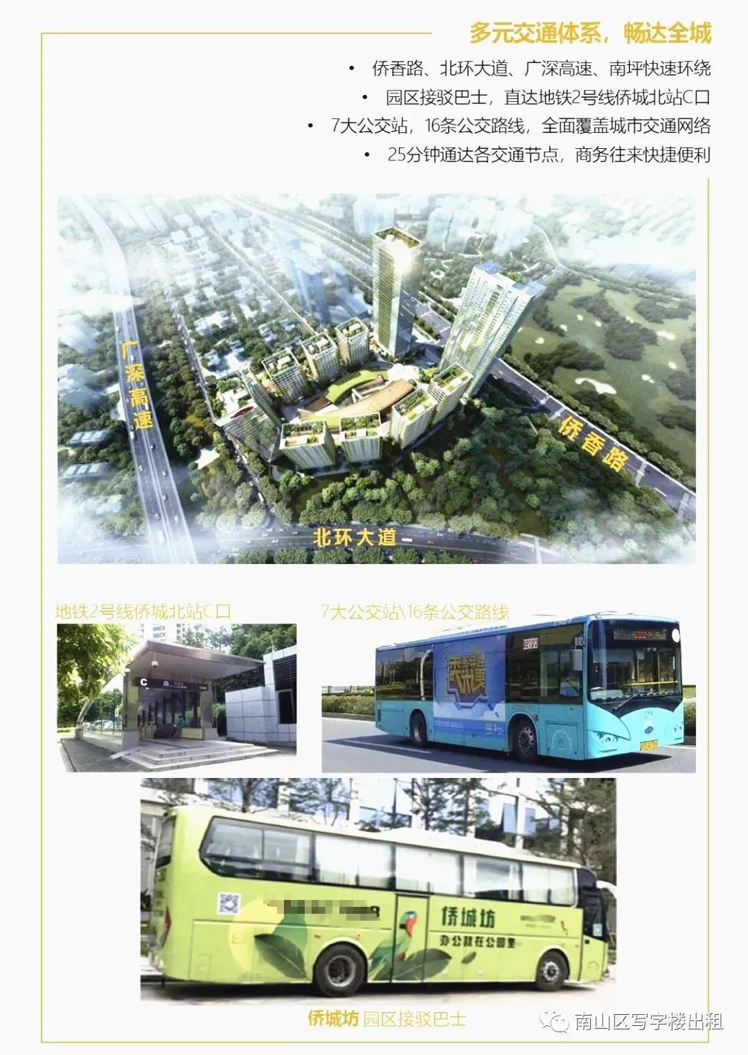 公路交通:侨香路/北环大道/广深高速,三大主干道环绕,25分通达全城