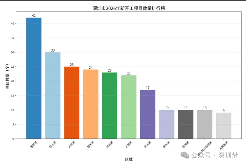 从项目数量来看,宝安区以42个项目位居第一,其次是南山区(30个)和龙岗区(25个)。前三大区域的项目数量占总数的44.6%,显示出这些区域在项目建设方面的强劲势头。