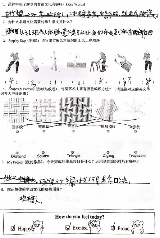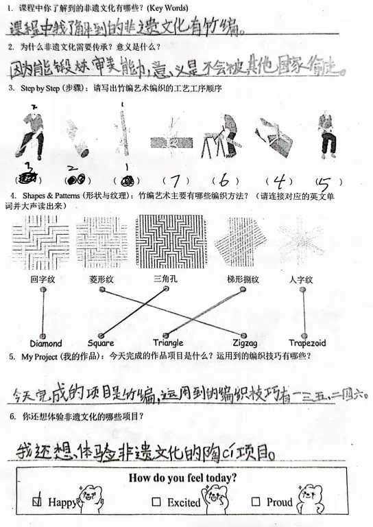 当古老的“挑一压二”技法呈现在眼前,孩子们惊喜地发现,手中的竹条编织出了各种熟悉的形状。任务单上的连线题成为了热门环节:将中式的纹理与英语单词Diamond(菱形)、Triangle(三角形)一一对应。