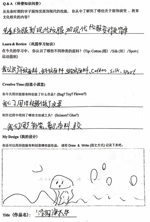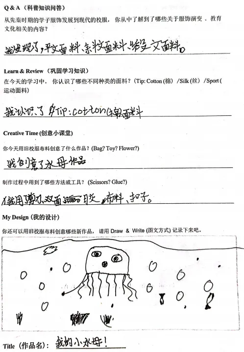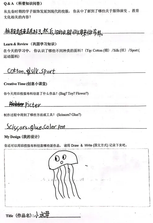 从触摸面料区分Cotton(棉)与Silk(丝),到旧衣改造环节的创意迸发,这里不仅有科普,更有环保教育。在“My Design”的绘图区,同学们脑洞大开,用彩笔画出了独特的创意,并用简单的英语短语标注了设计理念。