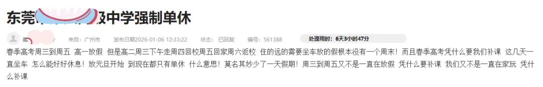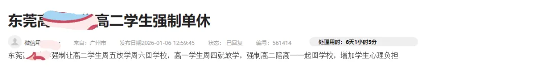 近日,东莞有多所高中在问政平台上遭到投诉,反映存在强制学生“单休”行为。投诉者反映称,学校为了春季高考,强制高二年级学生周五回家、周六返校,导致高二年级学生从放元旦开始到现在都只有“单休”,没有得到好好休息,增加了心理负担。2026年1月9日(周五)上午举行广东省普通高中物理、政治科目的学业水平考试,考生主要为高二年级学生,学生考完即可放假离校。为扎实做好考务工作并保障教学计划的总课时,学校根据实际需要进行调休,将周五与周日对调。因特殊原因无法按时返校的学生,可以向学校申请延迟返校。应该说,学校的安排是有客观原因的,只是在执行过程中沟通不到位导致部分学生、家长产生了误会。这也反映了部分学校在日常教学管理方面缺乏透明度以及人性化,有必要改进工作作风,加强跟学生、家长的沟通交流。毕竟只有充分的沟通,才能产生足够的理解与支持,才能避免不必要的误会,才能营造良好的教育氛围。而学生和家长,尤其是学生,也应该多理解和支持学校的工作。学校的时间安排不可能一成不变的,会由于节日、考试以及其他活动等原因,暂时调整常规的时间安排,不可避免会对学生、家长原定的一些安排或者作息规律造成影响,但出发点都是为了学生好以及保证教学进度,只要影响不大,不妨克服一下。如果实在有困难,不妨跟学校、老师商量,寻找一个解决的方案。高中学习任务重,时间争分夺秒,还是以学业优先比较好。
