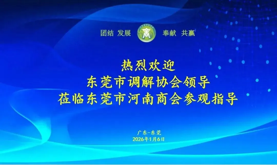 东莞市河南商会网站:http://www.dgshnsh.cn2026年1月6日下午,东莞市调解协会会长陈锡康率副秘书长朱宪辉、理事欧敬章、秘书处杨伟嘉等莅临东莞市河南商会参观指导交流。