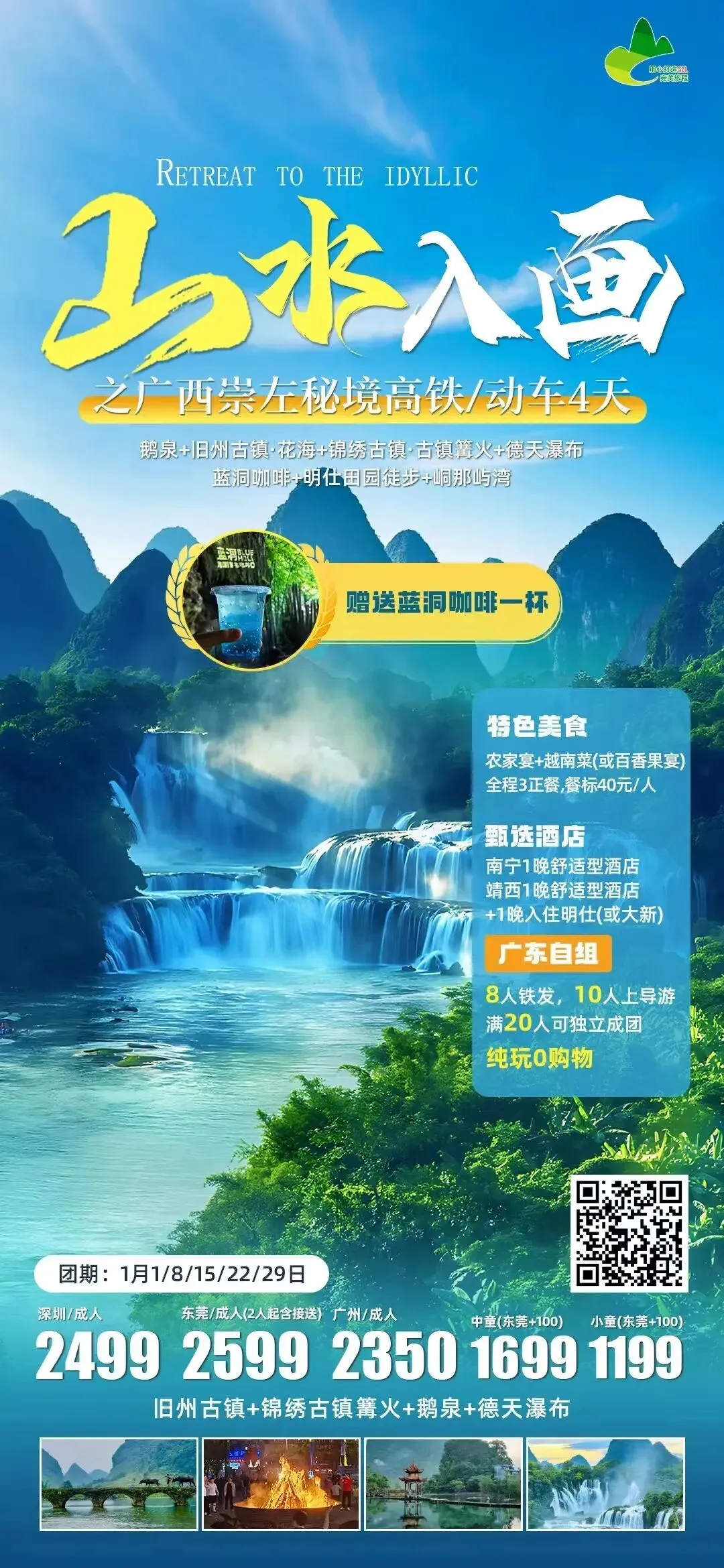后前往【蓝洞跨国瀑布咖啡】(游览时间约60分,含入园门票+赠一杯咖啡,赠送项目,不喝不退):位于广西崇左的蓝洞跨国瀑布咖啡,它是一个将咖啡体验与自然景观相结合的网红打卡地。中越最窄界河,站在界河边上,对面就是越南,独特的跨国风情背景,随便摆个姿势,分分钟get“脚踏两国”大片。观瀑平台,蓝洞跨国瀑布的磅礴景观尽收眼底,瀑布的水汽在阳光折射下偶尔还会出现彩虹,绝美景色与你同框。坐在水边喝咖啡,抬头是喀斯特峰林,转头是最窄界河,风一吹全是草木香,连呼吸都变治愈了~