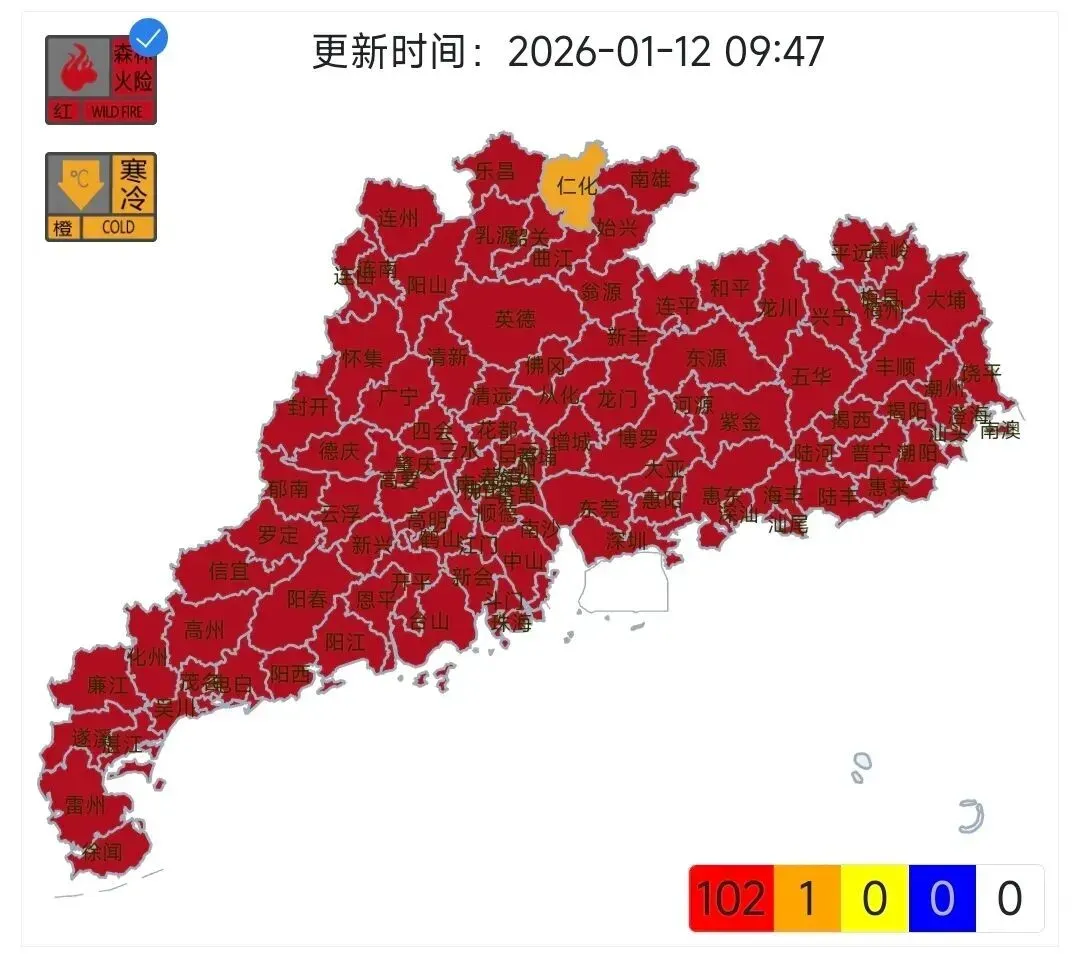 截至1月12日9:47,广东全省102个森林火险红色预警信号生效中。广州市、深圳市、珠海市、汕头市等部分地区森林火险等级为高度危险(五级),要发布禁火令,严禁一切野外用火;在林区所有路口布点设卡,严禁带火种进山;加密巡护频次,应急队伍靠前驻防。