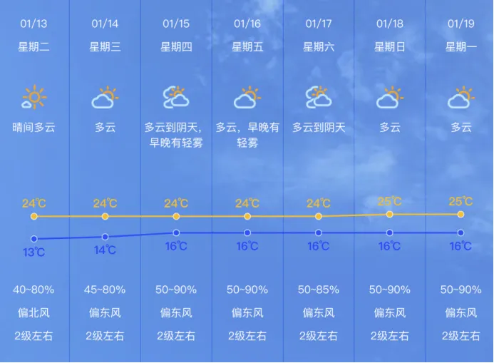预计未来一周我市气温逐步回升,其中13-14日晴到多云,15-17日云量较多,湿度增大,早晚有轻雾。目前我市森林火险红色预警信号正在生效,请注意用火用电安全。