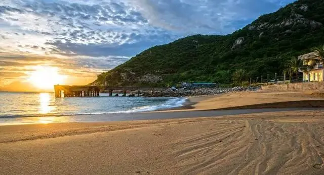 沙滩背靠群山,面朝大海,