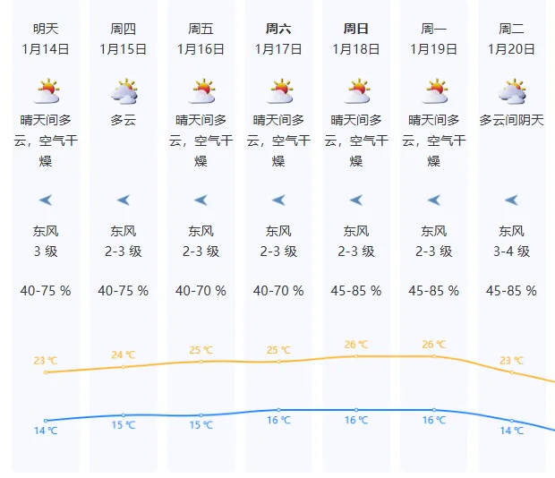 预计1月14日晴天干燥,气温14℃—23℃,东部沿海和高地最大阵风6级左右。