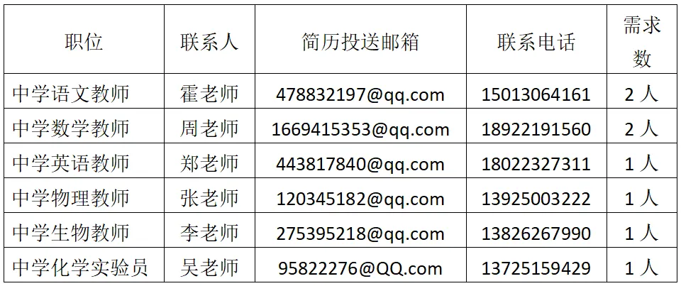 本次共招聘教师7名、化学实验员1名。(招聘的职位、类别及学科详见附件1职位表)。