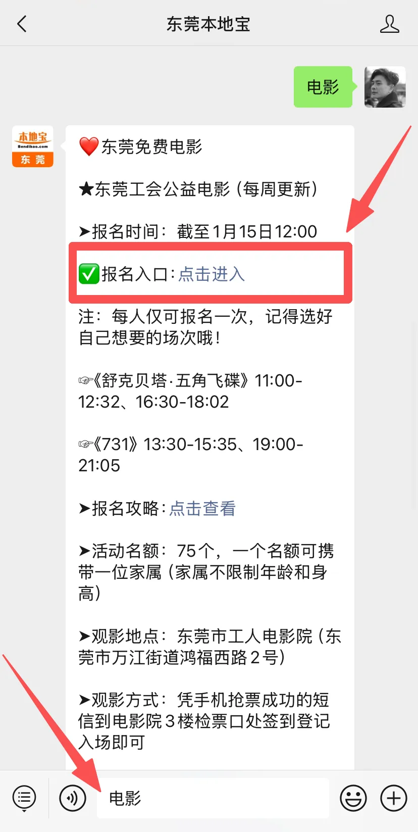 🔗报名入口:东莞工会官微,长按识别下方二维码关注东莞本地宝,在聊天对话框回复【电影】,即可获取免费报名入口!