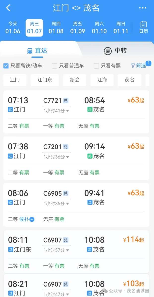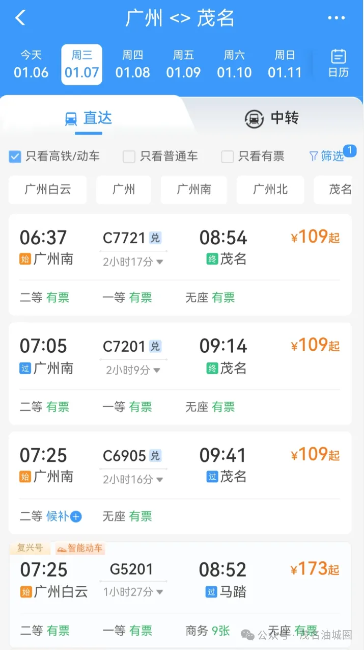 茂名朋友小编发现,广州南至茂名每天至少有2个车次车票最低为109元。此外,江门站往返茂名站部分车次也大幅下调至63元。请旅客通过12306官方渠道购票。