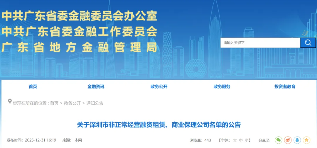 12月31日,广东省地方金融管理局发布《关于深圳市非正常经营融资租赁、商业保理公司名单的公告》: