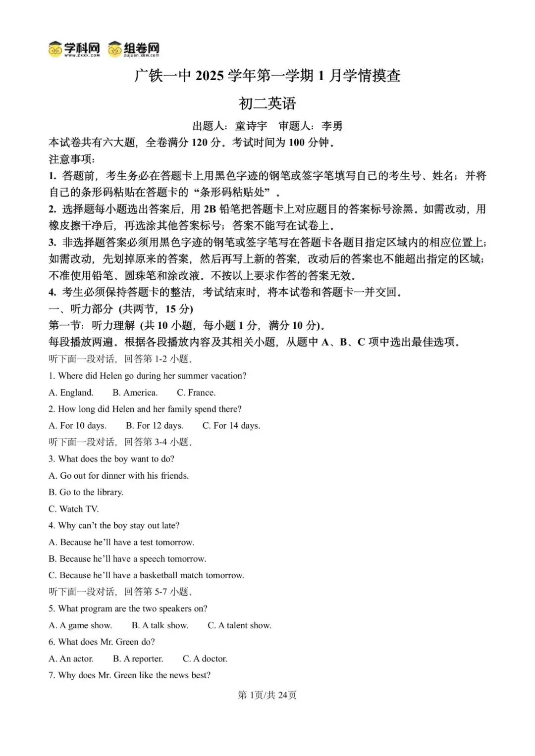 >精品解析:广东省广州市越秀区铁一中学2025-2026学年八年级上学期1月月考英语试题(解析版)