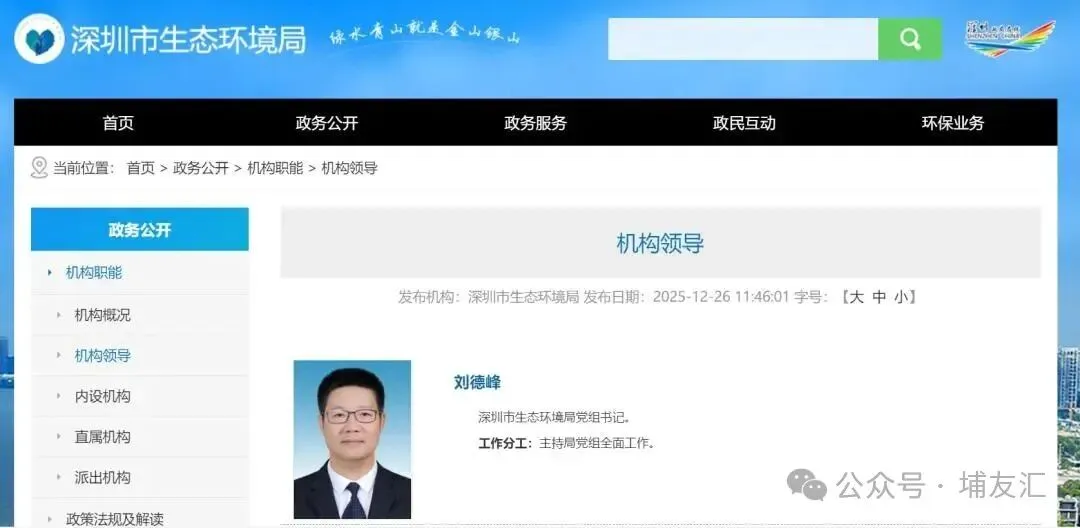 深圳市生态环境局官网近日更新机构领导信息,显示刘德峰已任该局党组书记,主持局党组全面工作。