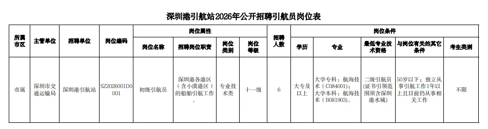 点击上方↑"高层次人才圈"关注我们 深圳港引航站为深圳市交通运输局下属事业单位,主要负责深圳港各港区(含小漠港区)的船舶引航工作。为加强引航队伍建设,深圳港引航站公开招聘初级引航员6名(专技十一级),具体岗位详见《深圳港引航站2026年公开招聘引航员岗位表》(以下简称《岗位表》,见附件1)。根据《中共中央组织部 人力资源社会保障部关于进一步做好事业单位公开招聘工作的通知》(人社部发〔2024〕57号)和《广东省事业单位公开招聘人员办法》(粤府令第301号)等有关规定,现将深圳港引航站公开招聘引航员有关事项公告如下: