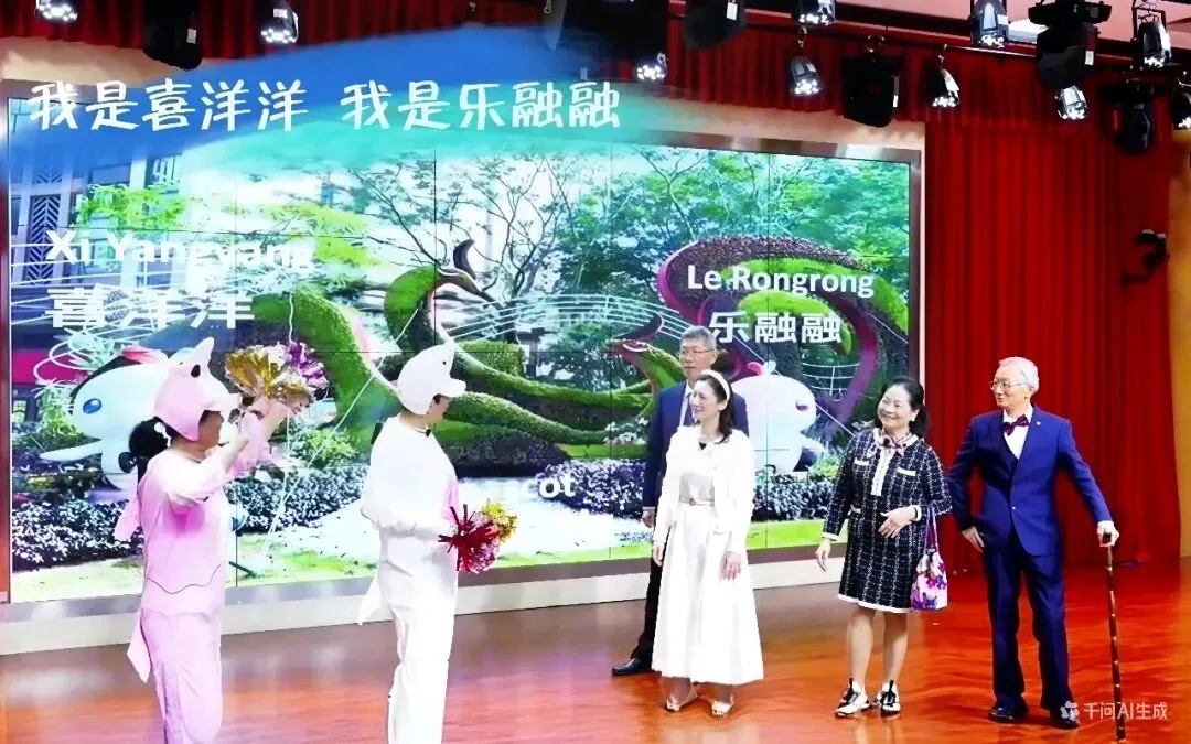 Voice-over: After morning tea, everyone headed to the Nansha Culture Sports Center, where the National Games mascots, Xi Yangyang and Le Rongrong, were ready to greet visitors.